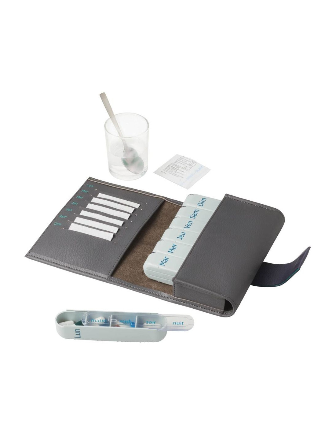 7 espaces de stockage pour les formes galéniques (types sachets en poudre) ou porte-cartes pouvant intégrer Carte Vitale, carte mutuelle, etc. Repères tactiles pour indiquer chaque prise.