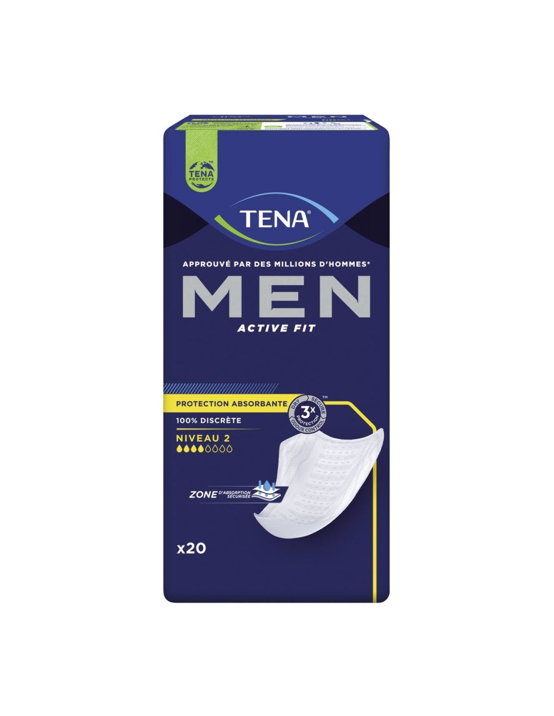 Les Tena Men Niveau 2 sont des protections urinaires qui s’adressent aux hommes actifs souffrant d’incontinence légère. Cette protection offre une capacité d’absorption de 480 ml et bénéficie d’un matelas ultra-absorbant qui capture immédiatement et retient le liquide loin de votre peau. Aussi, vous profiterez toujours de cette sensation d’être au sec. Par ailleurs, grâce au voile doux et aéré en non tissé qui recouvre l’intégralité de ces protections, les Tena Men Niveau 2 procurent confort et ne risquent pas d’irriter votre peau. Ces coquilles pour hommes se fixent parfaitement au sous-vêtement masculin grâce à ses trois larges bandes adhésives. Prenez juste soin de les porter avec un sous-vêtement moulant comme les slips. Évitez les caleçons. Vous les porterez ainsi en toute confiance. Vous serez totalement libre de vos mouvements. Discrets, les Tena Men Niveau 2 possèdent une forme incurvée qui épouse parfaitement l’anatomie masculine et disposent d’un système de neutralisation des odeurs. Si vous cherchez une protection plus absorbante, vous trouverez dans cette même gamme les Tena Men Niveau 3. Pour les petites fuites très légères, utilisez les Tena Men Niveau 1.