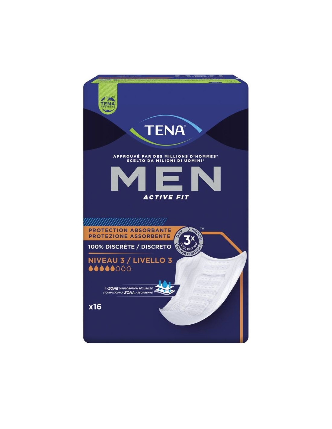 Les Tena Men Niveau 3 sont des coquilles pour hommes spécialement conçues pour vous protéger en cas d’incontinence légère à modérée. Ces protections urinaires bénéficient d’une zone ultra-absorbante qui retient jusqu’à 700 ml de liquide. Votre sécurité est garantie. Vous ne craindrez plus les fuites. Ces protections masculines se portent en toute discrétion grâce à leur coupe anatomique qui s’ajuste parfaitement au corps, leur système de neutralisation des odeurs ainsi que leur doux textile non bruyant. Pratiques, ces coquilles se fixent simplement au sous-vêtement grâce à trois larges bandes adhésives, vous laissant totalement libre de vos mouvements. Entièrement recouverts d’un voile micro-respirant en non-tissé, ces protections masculines laissent la peau respirer, écartent les risques d’irritation et procurent un très grand confort. Si vous ne souffrez que de fuites urinaires légères, optez pour les Tena Men Niveau 2. Pour les pertes d’urine très légères ou en cas d’incontinence d’effort, nous vous recommandons les Tena Men Niveau 1.