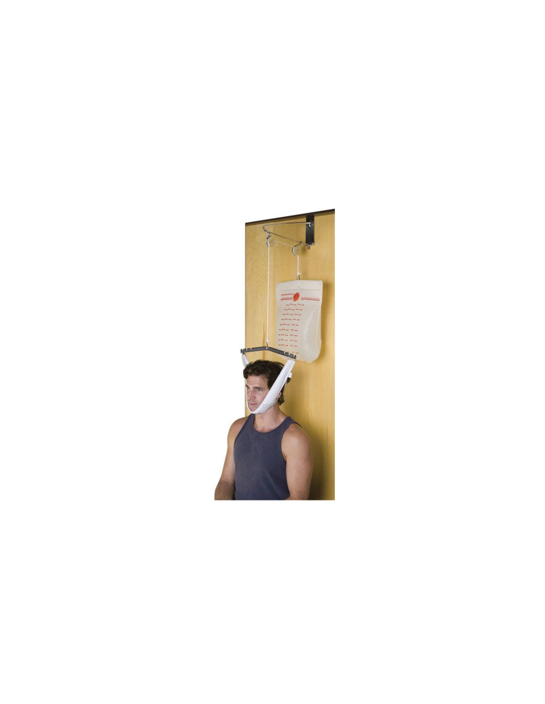 Ce kit de traction cervicale pour dessus de porte contient tout ce qui est nécessaire à l’administration de la traction cervicale par extension ou flexion au patient : cordes, sac d’eau, mentonnière, fléau et poulie pour dessus de porte.