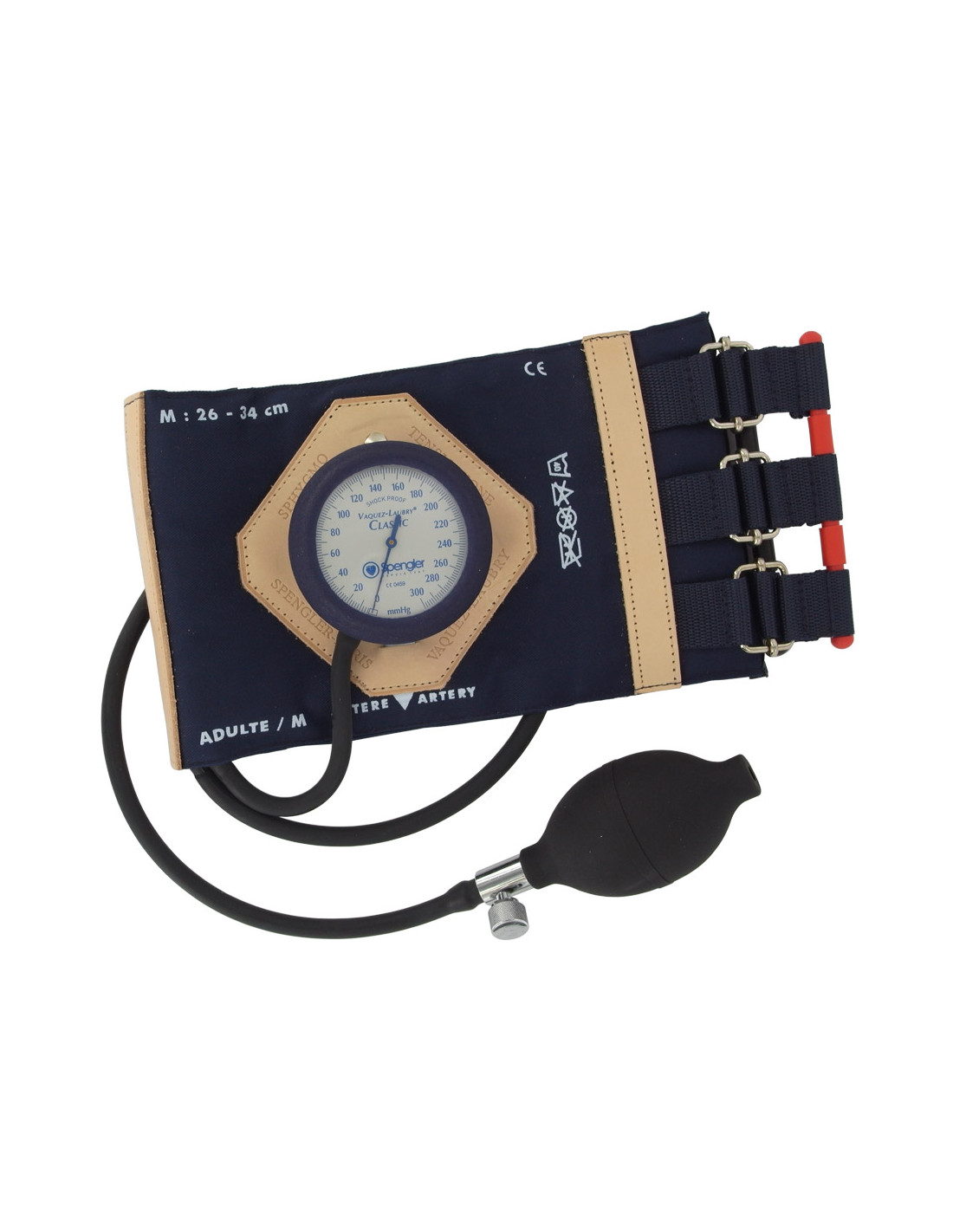 Synthèse du modernisme et de la tradition. Le plus célèbre des Vaquez-Laubry®. Version sangles. Brassard en polycoton avec support de manomètre en cuir pleine fleur. Poire grand volume. Livré en trousse nylon.