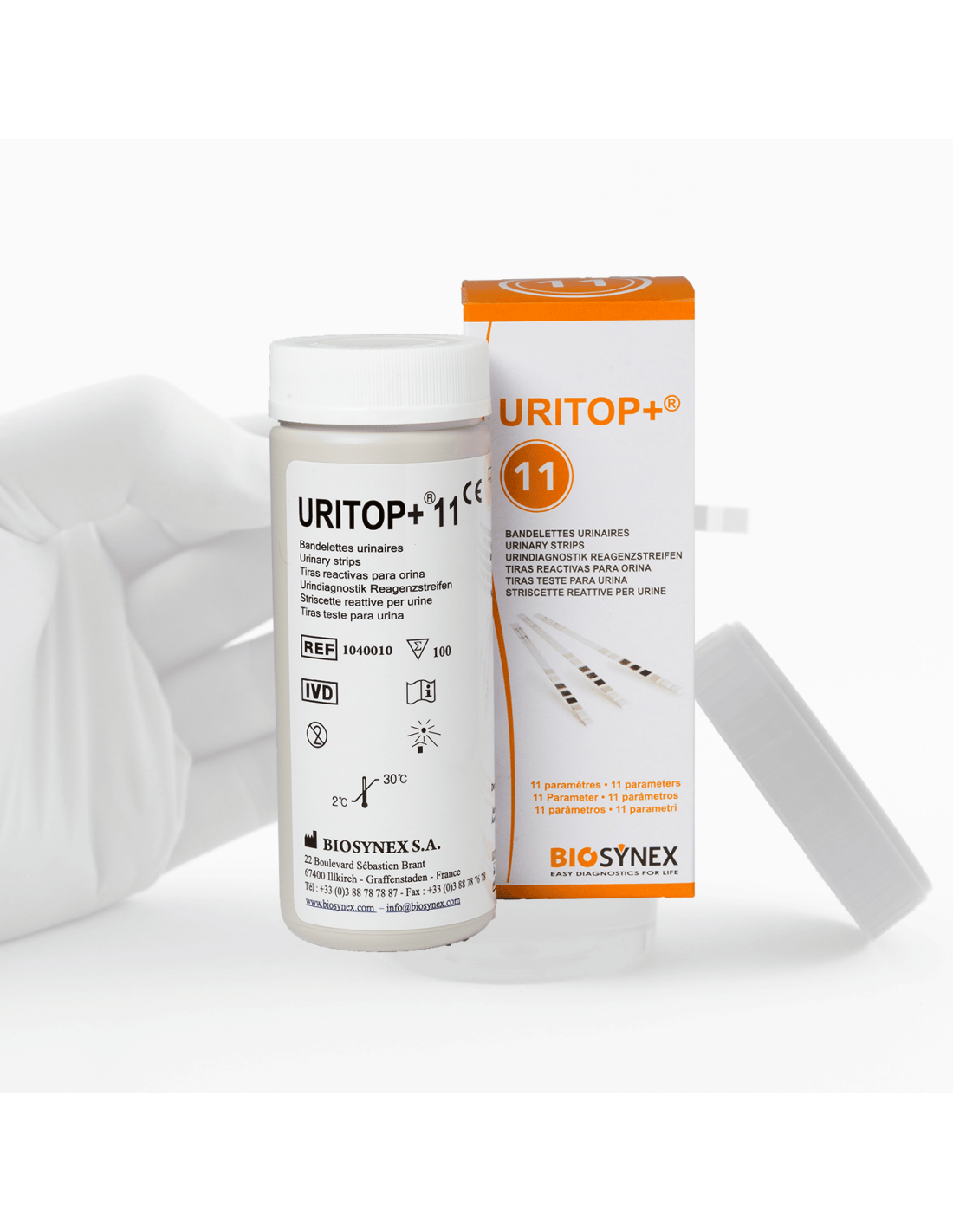Permet de contrôler 7 ou 11 paramètres :Glucose, densité spécifique, sang, leucocytes, protéine, nitrites et pH (7 paramètres). Bilirubine, corps cétoniques, urobilinogène et acide ascorbique (11 paramètres). Avec grille de lecture à l’échelle. ou automatisée sur Mini lecteur Uritop® + (disponible sur demande). Résultats en 60 secondes (sauf leucocytes : lire 90 à 120 secondes).